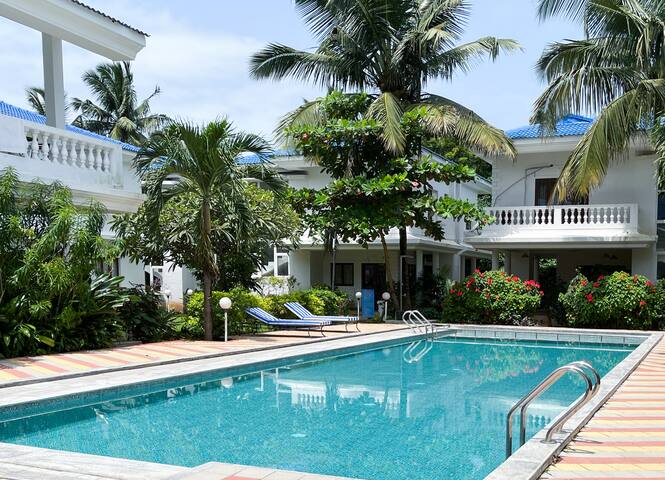 3. Private Pool and Outdoor Area: The highlight of this property is its private pool and outdoor space. Take a dip in the pool, lounge on the sunbeds, or enjoy a meal al fresco on the patio. This tranquil oasis is the perfect place to unwind and soak up the Goan sun.