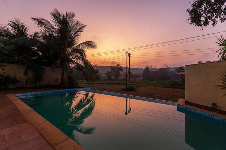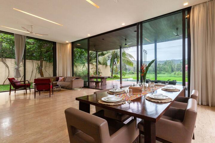 Escape to paradise at 3BHK Bella Antlia, a luxurious and private villa nestled in the charming village of Parra. This stunning property boasts a prime location with breathtaking views of lush green paddy fields and a private pool for the ultimate relaxation.