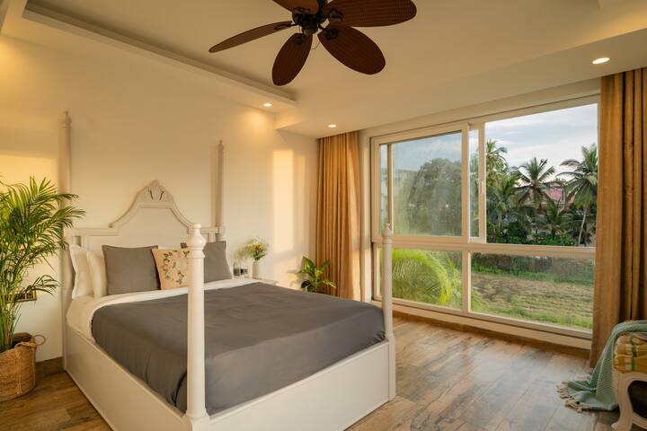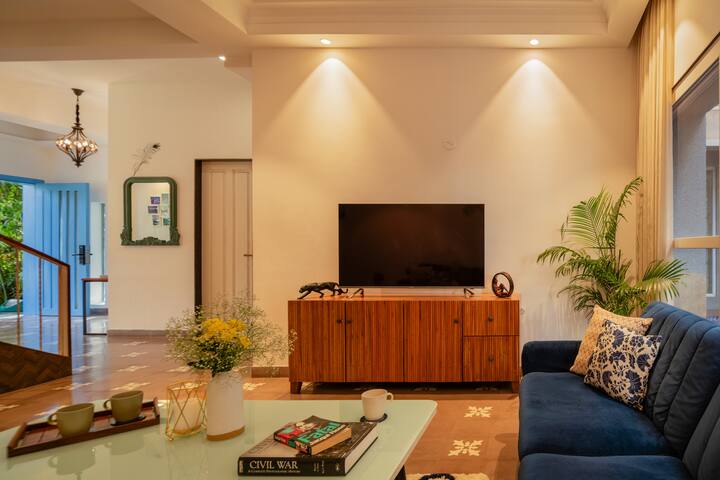 But that’s not all, the villa also has a private swimming pool where you can take a refreshing dip or lounge on the sunbeds and soak up the Goan sun. And if you’re looking for some outdoor fun, the property also has a large garden area perfect for a game of frisbee or a barbecue night with your loved ones.