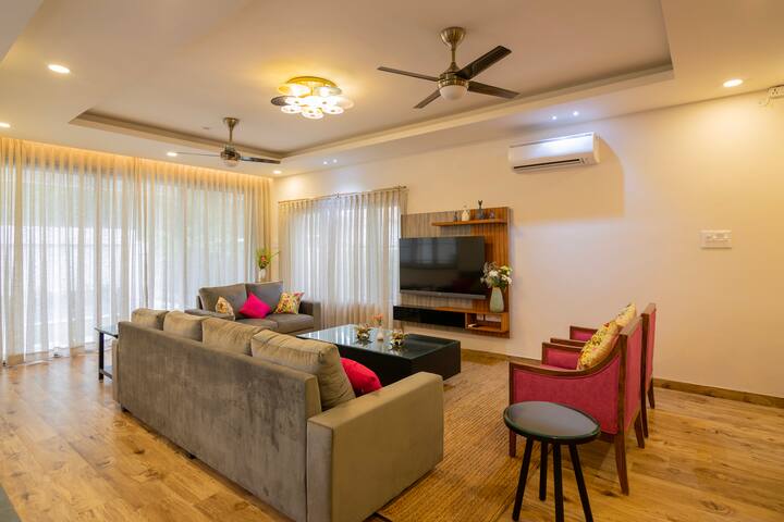 The villa boasts a private pool, perfect for a refreshing dip on a hot summer day. Surrounded by lush greenery and a spacious sundeck, it’s the ideal spot for lounging and soaking up the sun. The interiors are tastefully designed with modern furnishings, creating a chic and welcoming ambiance.
