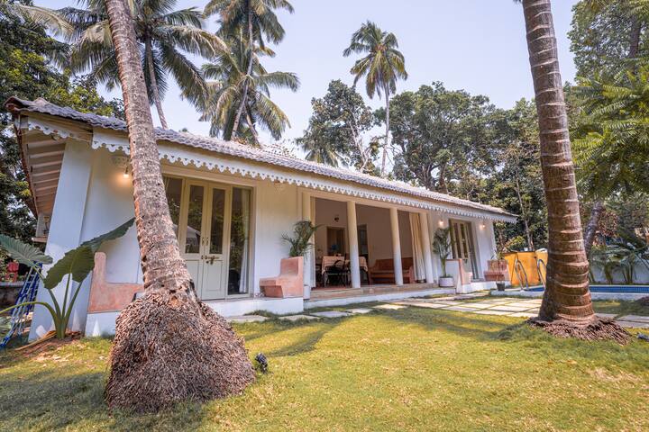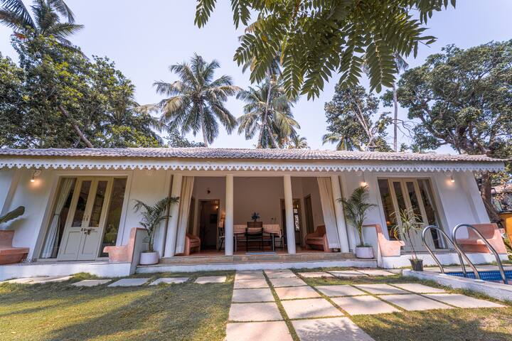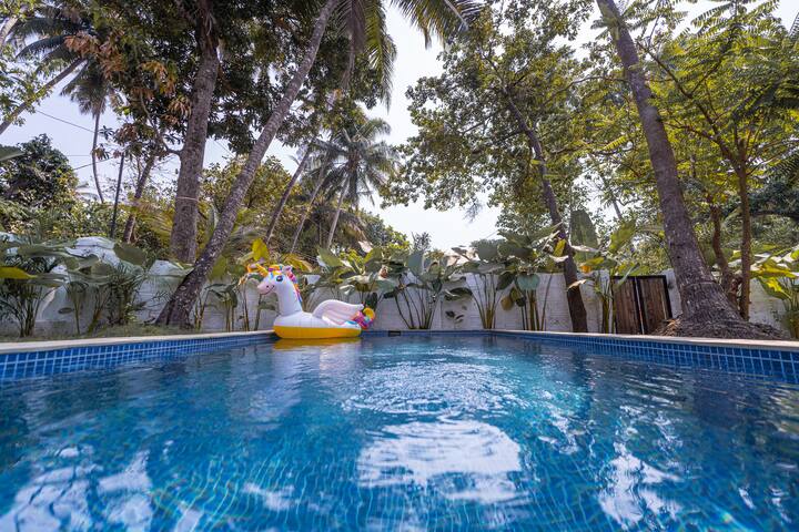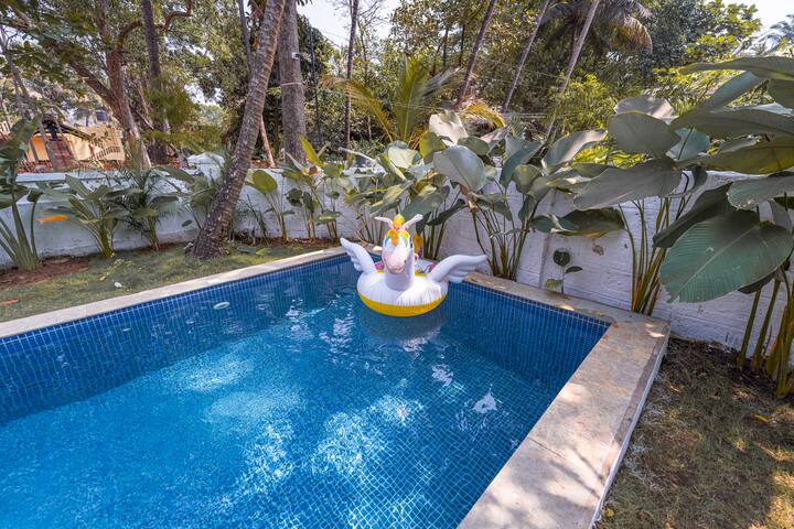 Nestled in the heart of Anjuna, this stunning villa offers everything you need for a perfect getaway. The first thing you’ll notice is the private pool, surrounded by lush greenery and a cozy outdoor seating area. It’s the perfect spot to relax and soak up the warm Goan sun.