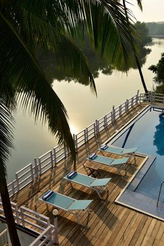 But the real highlight of this villa is its stunning outdoor space. Imagine waking up to the sound of birds chirping and enjoying your morning coffee on the private balcony overlooking the river. Or spending lazy afternoons lounging by the sparkling pool, surrounded by the picturesque landscape.