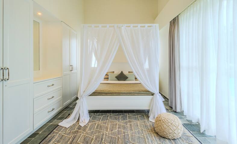 The first thing you’ll notice upon arrival is the villa’s gorgeous private pool, surrounded by lush greenery and offering complete privacy for you and your guests. Take a refreshing dip in the crystal-clear water, soak up the sun on the comfortable loungers, or unwind with a drink in the shaded outdoor seating area.