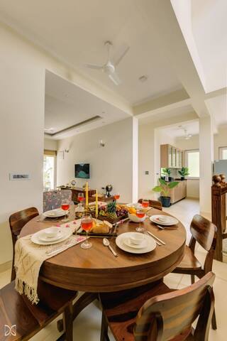 Cook up a storm in the fully equipped kitchen, complete with all the necessary appliances and utensils. Or, if you prefer, you can hire a private chef to whip up delicious meals for you and your guests. Enjoy your meals in the elegant dining area or take them outside to the cozy outdoor seating area by the pool.