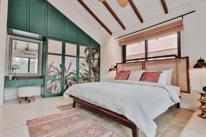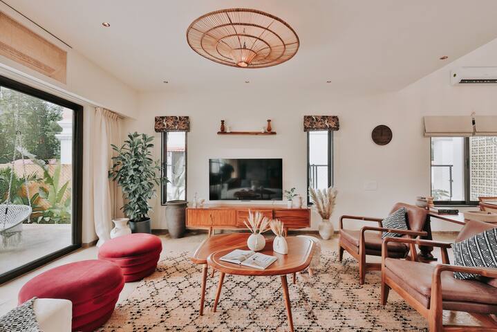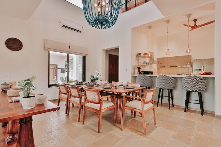 Inside, the villa exudes an eclectic and chic vibe with its tasteful decor and unique furnishings. The spacious living area is the perfect spot to gather with your loved ones, watch a movie on the flat-screen TV, or curl up with a good book. The fully equipped kitchen allows you to prepare your own meals, or you can opt for our private chef service and indulge in a delicious meal without lifting a finger.