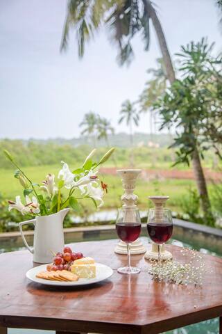 Welcome to paradise at Frangipani by Hireavilla! This stunning 3-bedroom villa offers the ultimate escape for guests seeking a luxurious and tranquil retreat in the heart of nature. Located in the peaceful village of Siolim, this property is surrounded by lush green fields and boasts a private pool with breathtaking views.