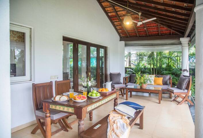 Step inside and be mesmerized by the spacious and beautifully decorated interiors. The villa exudes a modern yet rustic charm with its wooden furnishings and traditional Indian artwork. The living room is a cozy haven, perfect for lounging with your loved ones or catching up on your favorite shows on the flat-screen TV. The fully equipped kitchen is a dream for any aspiring chef, and the dining area is ideal for enjoying delicious meals together.