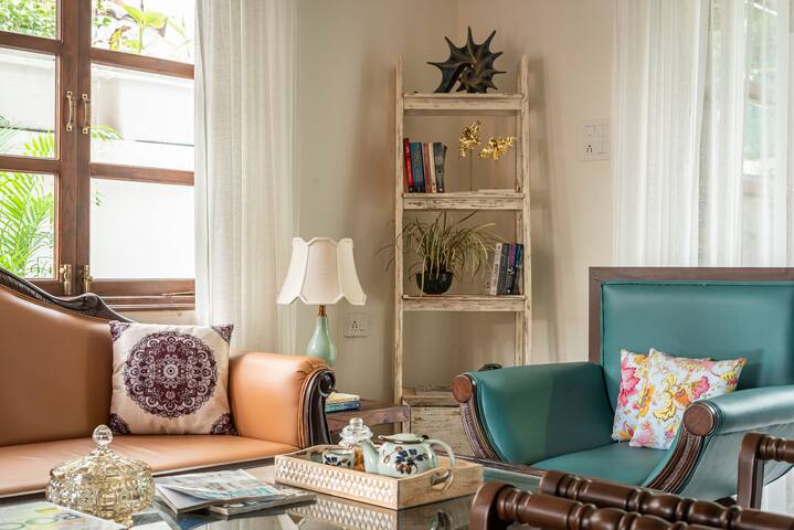 4. Stylish Interiors: The villa’s interiors are a perfect blend of modern and traditional Goan style, creating a warm and inviting atmosphere. The living room opens up to a spacious balcony with stunning views, providing the perfect spot to relax and unwind.