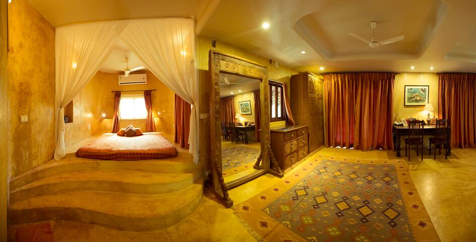 Upon entering Shahi Suite, you will be greeted by intricate Rajasthani architecture and exquisite decor that exudes opulence and grandeur. The spacious living area is adorned with elegant furnishings, traditional artwork, and plush cushions, providing the perfect setting to relax and unwind after a day of exploring.