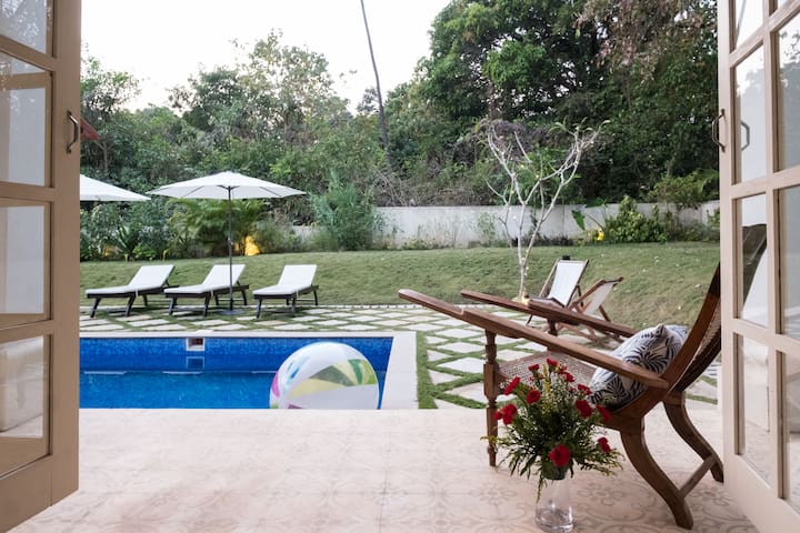 One of the top highlights of Sol Sureno is the stunning outdoor area. The private pool is perfect for a refreshing dip and the spacious patio is ideal for soaking up the Goan sun. Enjoy a morning cup of coffee or a romantic dinner under the stars in this picturesque setting.