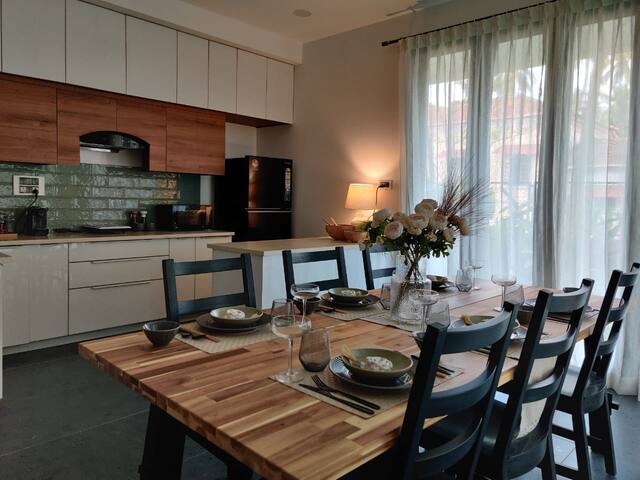 One of the highlights of this villa is its outdoor space. Take a dip in the sparkling pool or relax on the comfortable sun loungers while soaking up the warm Goan sun. The beautifully landscaped garden is perfect for a morning yoga session or a peaceful evening stroll. And for those who love to cook, the villa has a fully equipped kitchen where you can whip up your favourite meals.
