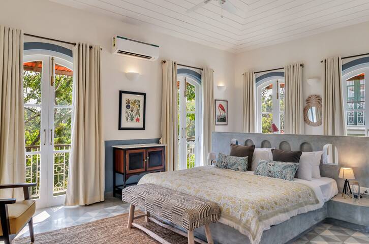 Inside the villa, you’ll find a spacious living area that seamlessly blends modern comforts with traditional Goan architecture. The high ceilings and wooden furnishings create a warm and inviting atmosphere, perfect for spending quality time with family or friends. The fully equipped kitchen has everything you need to whip up a delicious meal, and the dining area is the ideal spot to enjoy it together.